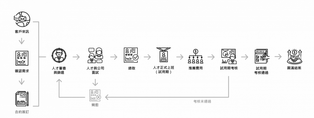 從刊登招聘廣告、資格審查、面試、篩選人才等工作,皆由我們的專業招聘顧問團隊處理,依實際正式錄用人數收費,以確保客戶與我們的合作符合成本效益。